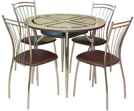 Стол «Шанхай-К» Размер, см: диаметр 90 Материал: МДФ, стекло, хром Цена 9 590 руб. Стул «Олива-2» Материал: кож.зам, хром Цена 2 840 руб.