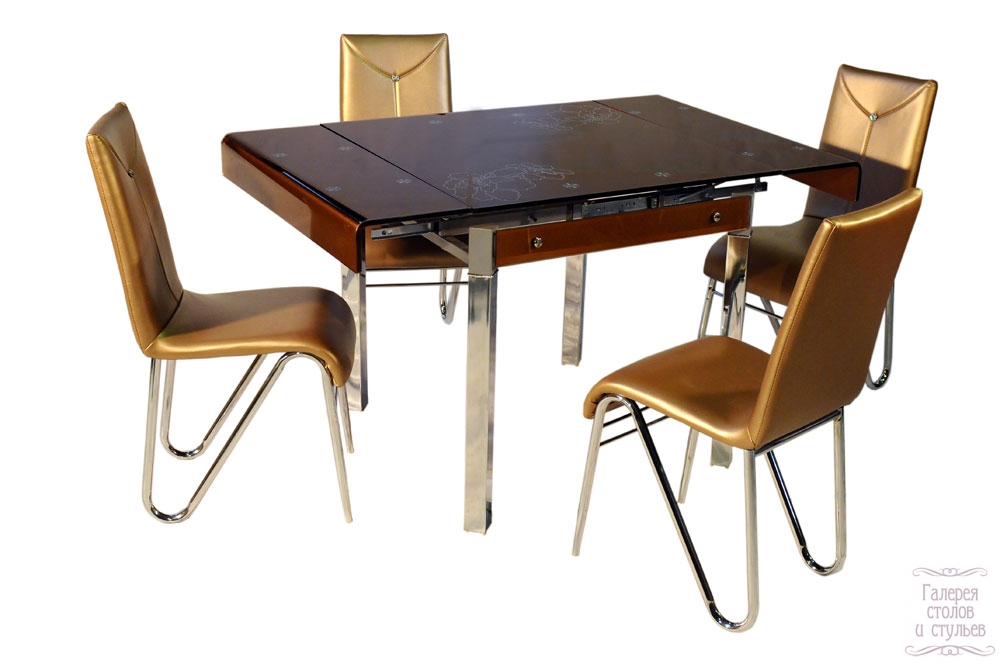 Cтол-трансформер Т -225 производство Китай, столешница каленое стекло, каркас и ноги хром Цвет; лиловый, бронза, белый! Размеры Длина 130 Высота 75 Ширина 80 Толщина стекла 12 мм Цена 14 000 руб. Стул  F 6В Производство Китай,  каркас металлический хромированный.  Сиденья мягкие из кож. заменителя.  Варианты цветов  на выбор Цена 2 300 руб.
